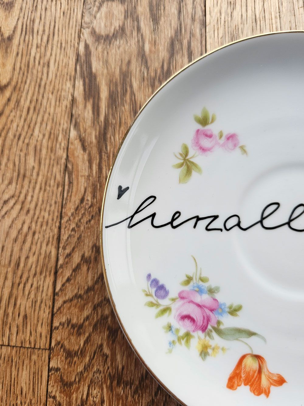 Handbeschriftete Vintage-Teller mit Herz und Seele